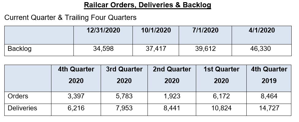 Newly released data by the RSI American Railway Car Institute Committee (ARCI) shows that freight railcar orders declined by over 40 percent in the fourth quarter. Deliveries and backlog also declined as the industry continues to grapple with economic challenges as a result of COVID-19.
